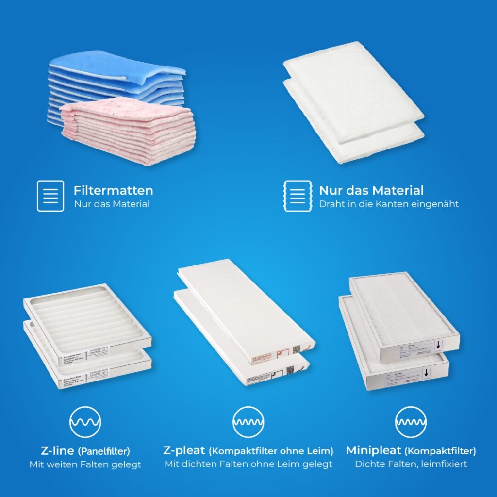 - Z-Pleat (Kompakte, klebstofffreie Filter). Diese Bauweise gehört zu den hochwertigsten Filtern und verwenden dicht gepackte Falten ohne Klebstoff. Sie behalten ihre Form und Wirksamkeit während ihrer gesamten Lebensdauer bei. Erhältlich sind sie unter anderem für Marken wie Zehnder.